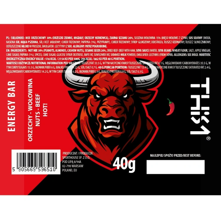 Baton THIS 1 z wołowiną HOT! to baton energetyczny stworzony na bazie orzechów i nasion z dodatkiem wołowiny na ostro. Jest idealnie zbilansowany tak by zapewnić mocny długotrwały zastrzyk energii. Duża ilość energii jest zapewniona przez optymalną proporcję cukrów (energia szybka) i tłuszczu (energia „długa”), gdzie tłuszcze zapewniają 2x więcej energii w przeliczeniu na 1 gram.