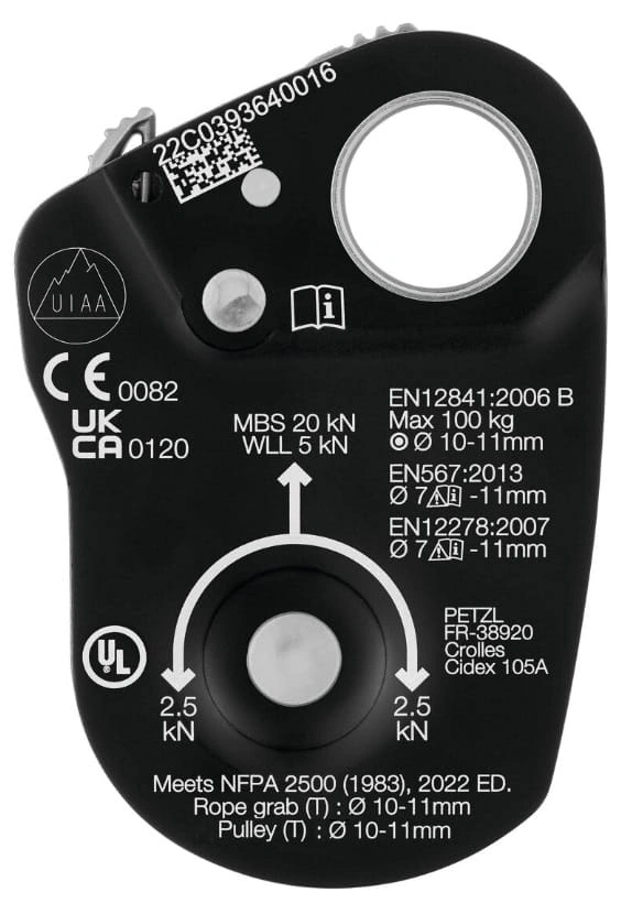 • CE EN 567, CE EN 12278, CE EN 12841 tyb B, UKCA, NFPA 2500 Technical Use Pulley and Rope grab