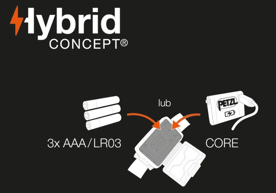• Zasilanie: 3 baterie AAA/R03 (dostarczane z czołówką) lub akumulator CORE (dostępny jako akcesorium)