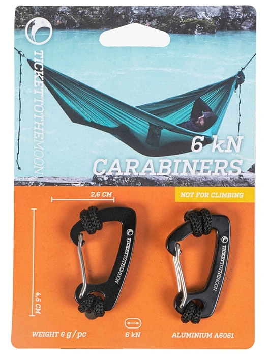 Karabińczyki Ticket to the Moon, wygodne i bezpieczne w użyciu. Przeznaczone do wieszania hamaków i akcesorii.
