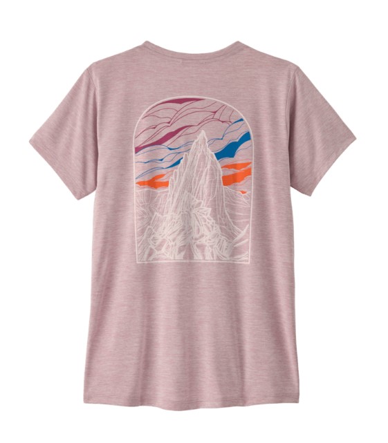 Artysta Vernan Kee stworzył grafikę Cloud Crag, przedstawiającą masyw Fitz Roy wyłaniający się z chmur. Nadruk wykonaliśmy metodą sitodruku na damskiej koszulce Capilene® Cool Daily — wszechstronnym technicznym T-shircie zaprojektowanym tak, aby odprowadzał wilgoć i rozciągał się podczas ruchu. Uszyty z jedwabiście miękkiej tkaniny, daje uczucie chłodu nawet w upalne dni.