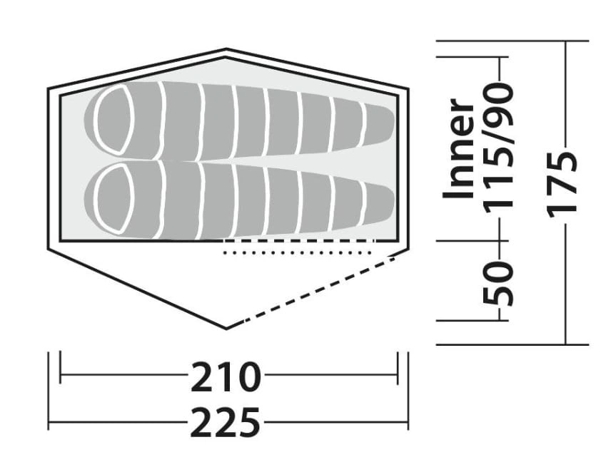 Namiot dwuosobowy. Rozkłada się go łatwo i szybko za pomocą zaczepów do głównego pałąka, który jest wstępnie wygięty, aby zmaksymalizować przestrzeń użytkową i wygodę. Cztery dołączone krótkie słupki narożne dodają wysokości przy głowie i nogach. Odporne na owady drzwiczki z siatki i otwory wentylacyjne, które można regulować od wewnątrz, poprawiają wentylację.