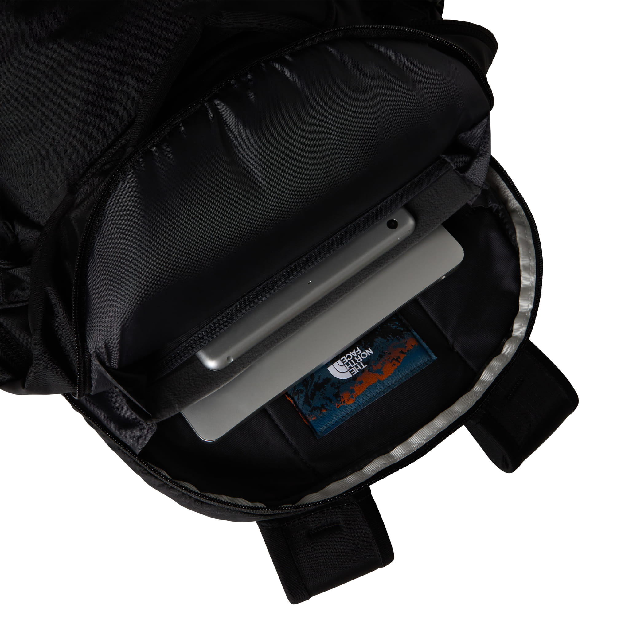 - Przednia komora posiada wewnętrzne rozwiązania organizacyjne, w tym kieszenie zapinane na zamek błyskawiczny oraz wyściełaną przegrodę na tablet