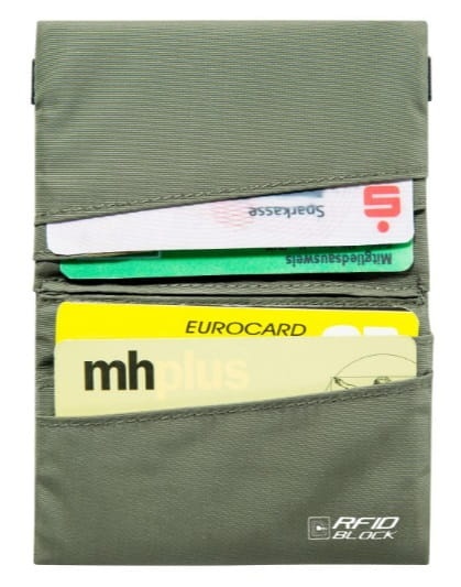 Składane etui ze zintegrowaną blokadą RFID na karty identyfikacyjne, kredytowe i płatnicze, niezawodnie chroni je przed kradzieżą danych.