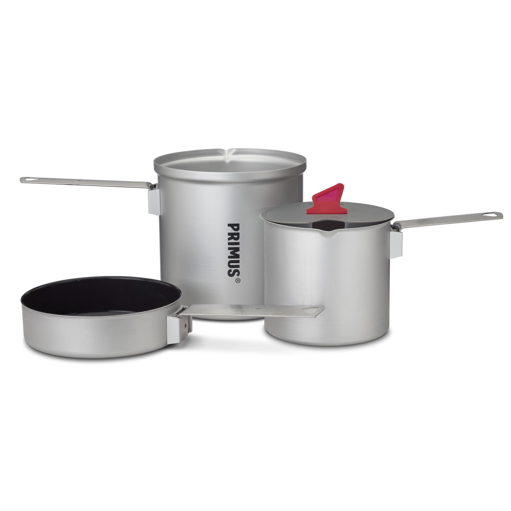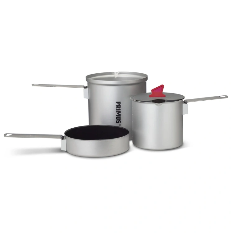 Lekki zestaw naczyń zawierający 2 garnki, pokrywkę i patelnię, wykonane z anodyzowanego aluminium od szwedzkiej marki Primus.