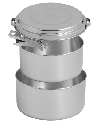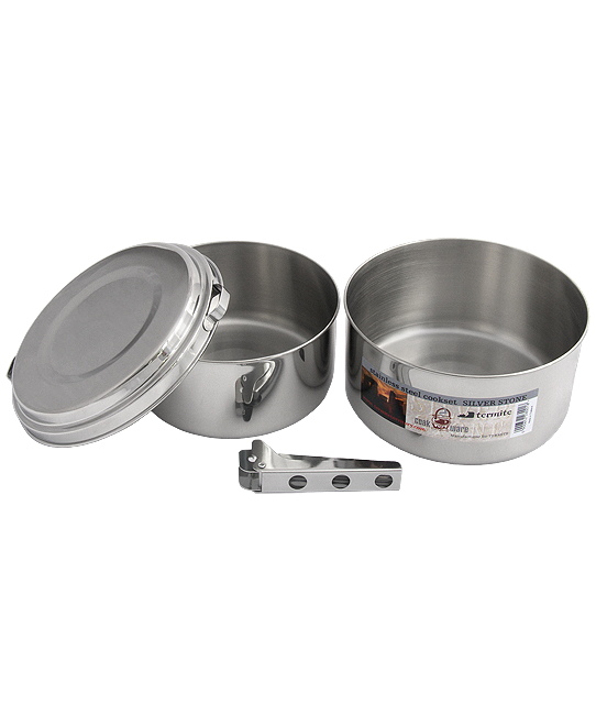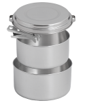 Naczynia Silverstone I. Zestaw naczyń turystycznych wykonany z najwyższej jakości stali, składajacy się z dwóch naczyń oraz patelni.